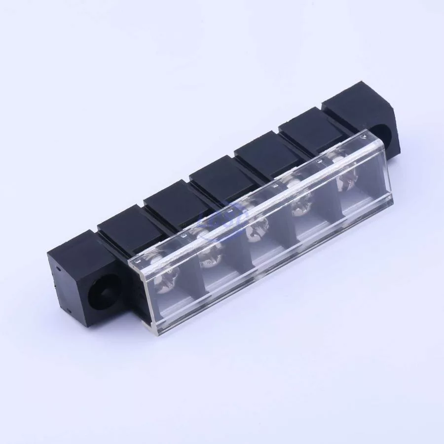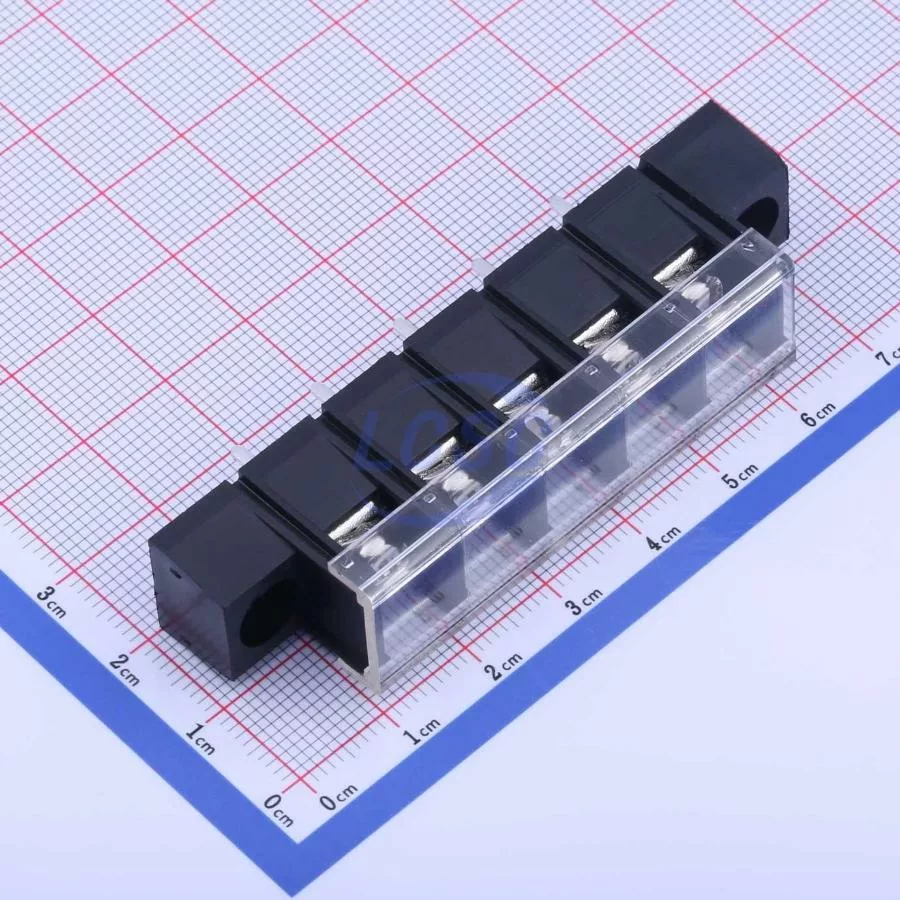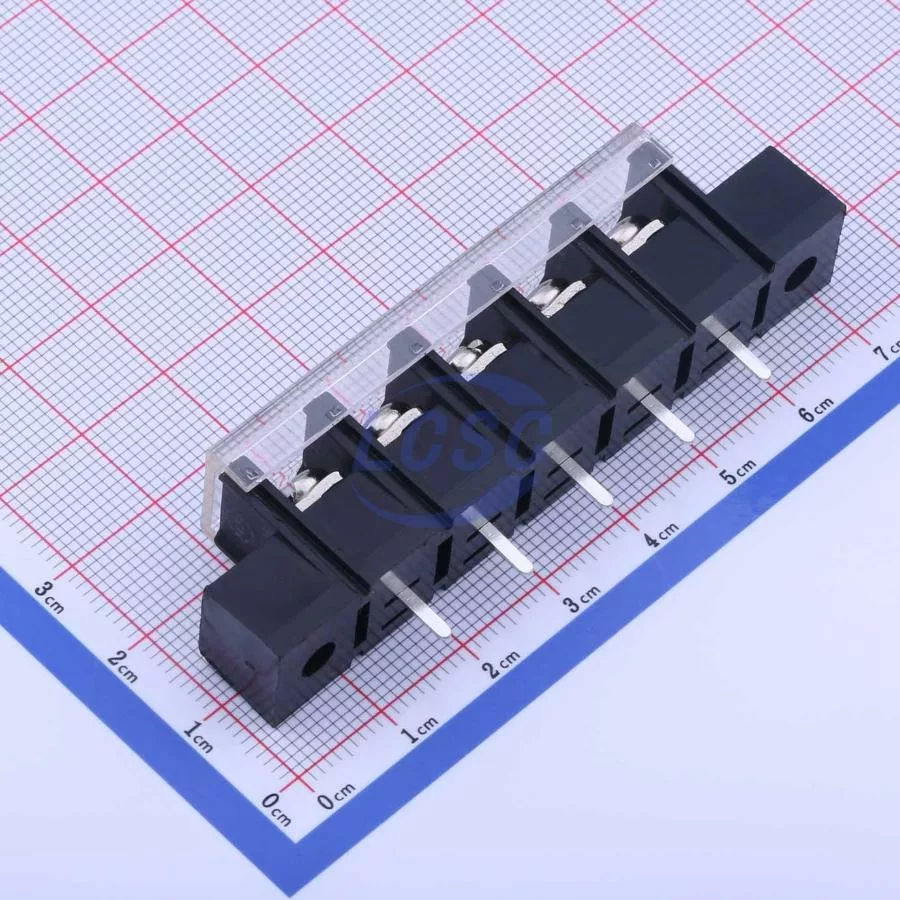 Description: 1x5P Mid Terminal With Cover Plate 5 1 10mm -40℃~+105℃ 32A 750V Black 12~22 Straight Pin 4 Through Hole,P=10mm Barrier Terminal Blocks ROHS