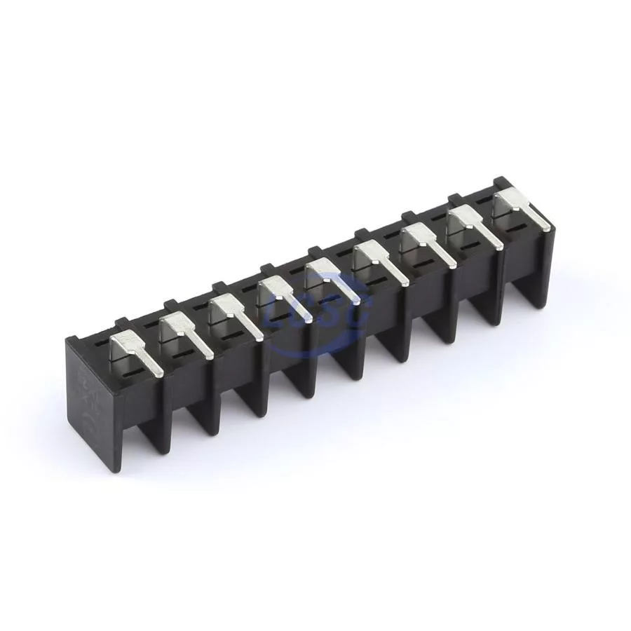 Description: 1x9P 2-Side 9 1 7.62mm -40℃~+105℃ 15A 300V Black 14~22 Right-Angle Pin 0.5~1.5 Through Hole,Right Angle,P=7.62mm Barrier Terminal Blocks ROHS